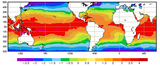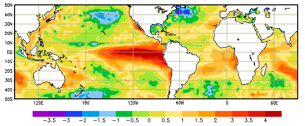 Beim Parameter SST zeigte sich das El Niño-Ereignis nur undeutlich in den absoluten Temperaturwerten (Abb. 4), wohingegen es in den Anomaliewerten klar zum Ausdruck kommt (Abb. 5).