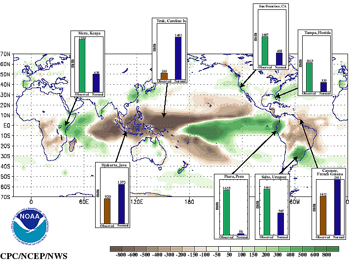 Für die Klimacharakterisierung eines Ortes ist die Abweichung von der normalen (durchschnittlichen) Niederschlagsmenge genau so wichtig wie die mittlere oder durchschnittliche Niederschlagsmenge. Im Dezember 1997 war beispielsweise die zentrale Amazonasregion (Pará) deutlich niederschlagsreicher als der Nordosten (Nordeste), vgl. Abb. 1. Die Niederschlagsanomalien belegen allerdings, dass Para ungewöhnlich trocken war, was für den ariden Nordeste nicht zutraf (Abb. 2). Trockenphasen im Amazonasgebiet kommen häufig während El Niño-Ereignissen vor, wie dies 1997 der Fall war.