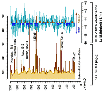Park- und Profilnahmezyklus Von den vielen Stoffen, die in den Eisbohrkernen enthalten sind, zeigt die Grafik zwei: Den Gehalt an Sulfat (gelb) und den Anteil des Sauerstoffisotops 18O. Die gelbe Kurve zeigt sehr genau, dass sich im Eis auch die Auswirkungen von Ereignissen an anderen Ecken der Welt ablesen lassen. Die hohen Ausschläge markieren große Vulkanausbrüche, die viel Sulfat in die Atmosphäre geschleudert haben. Sie lassen sich relativ genau datieren. Bei einigen kann man das Ausbruchsjahr nur ungefähr angeben, daher ist die Abweichung +/- x hinter der Jahreszahl vermerkt. Die blaue Kurve zeigt, bei welcher Temperatur das Eis einmal gefroren ist. Im Mittel waren das -45°C. Wärmere, rot markierte und kältere gekennzeichnete Phasen werden hier ganz deutlich. |