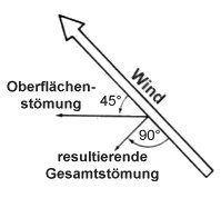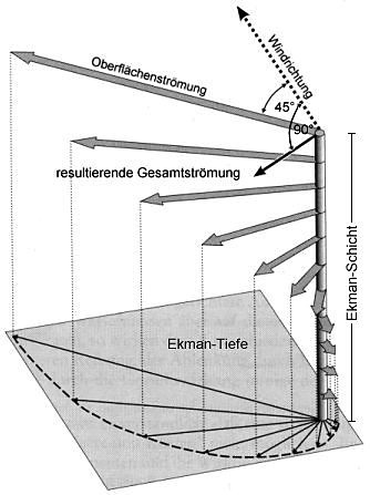 Wind, der über eine Wasseroberfläche weht, übt eine Schubkraft auf diese in Windrichtung aus. Die Corioliskraft lenkt die Bewegung ab, auf der Nordhalbkugel nach rechts, auf der Südhalbkugel nach links. An der Oberfläche liegt die Strömungsrichtung 45° zum Wind. Über Reibungkräfte teilen die an der Oberfläche bewegten Wasserteilchen die Schubkraft des Windes auch tieferliegenden Schichten mit. Durch die Reibung verringert sich die Geschwindigkeit, und die Richtung ändert sich stetig mit der Coriolis-Beschleunigung, so dass die Endpunkte der Vektoren eine Spirale beschreiben. Mit fortschreitender Tiefe werden Geschwindigkeit und Reibung vernachlässigbar klein.