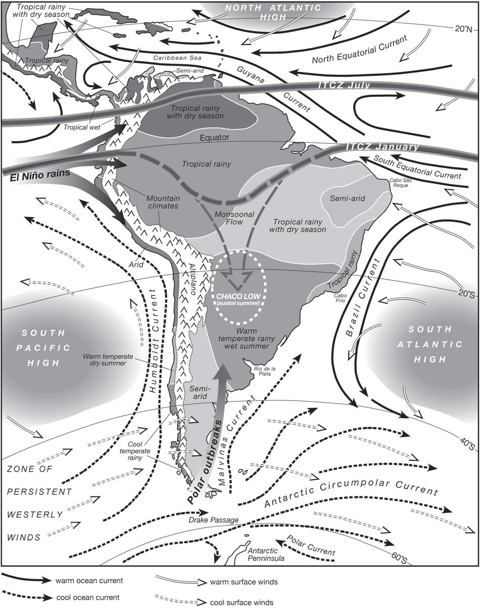 Die atmosphärischen Phänomene Südamerikas werden stark von den topographischen Merkmalen und Vegetationsmustern über dem Kontinent sowie von den sich langsam verändernden Randbedingungen der angrenzenden Ozeane beeinflusst. Die vielfältigen Muster von Wetter, Klima und klimatischen Variabilität über Südamerika, einschließlich tropischer, subtropischer und mittlerer Breitengrade, ergeben sich aus der langen meridionalen Spannweite des Kontinents, von nördlich des Äquators im Süden bis 55°S. Die Andenkordillere, die sich kontinuierlich entlang der Westküste des Kontinents erstreckt, erreicht Höhen von über 4 km am Äquator bis etwa 40°S und stellt daher ein gewaltiges Hindernis für Strömungen in der Troposphäre dar. Die Anden wirken nicht nur als Klimascheide mit trockenen Bedingungen im Westen und feuchten Bedingungen im Osten in den Subtropen (das Muster ist in den mittleren Breitengraden umgekehrt), sondern sie fördern auch tropisch-außertropische Wechselwirkungen, insbesondere entlang ihrer Ostseite.