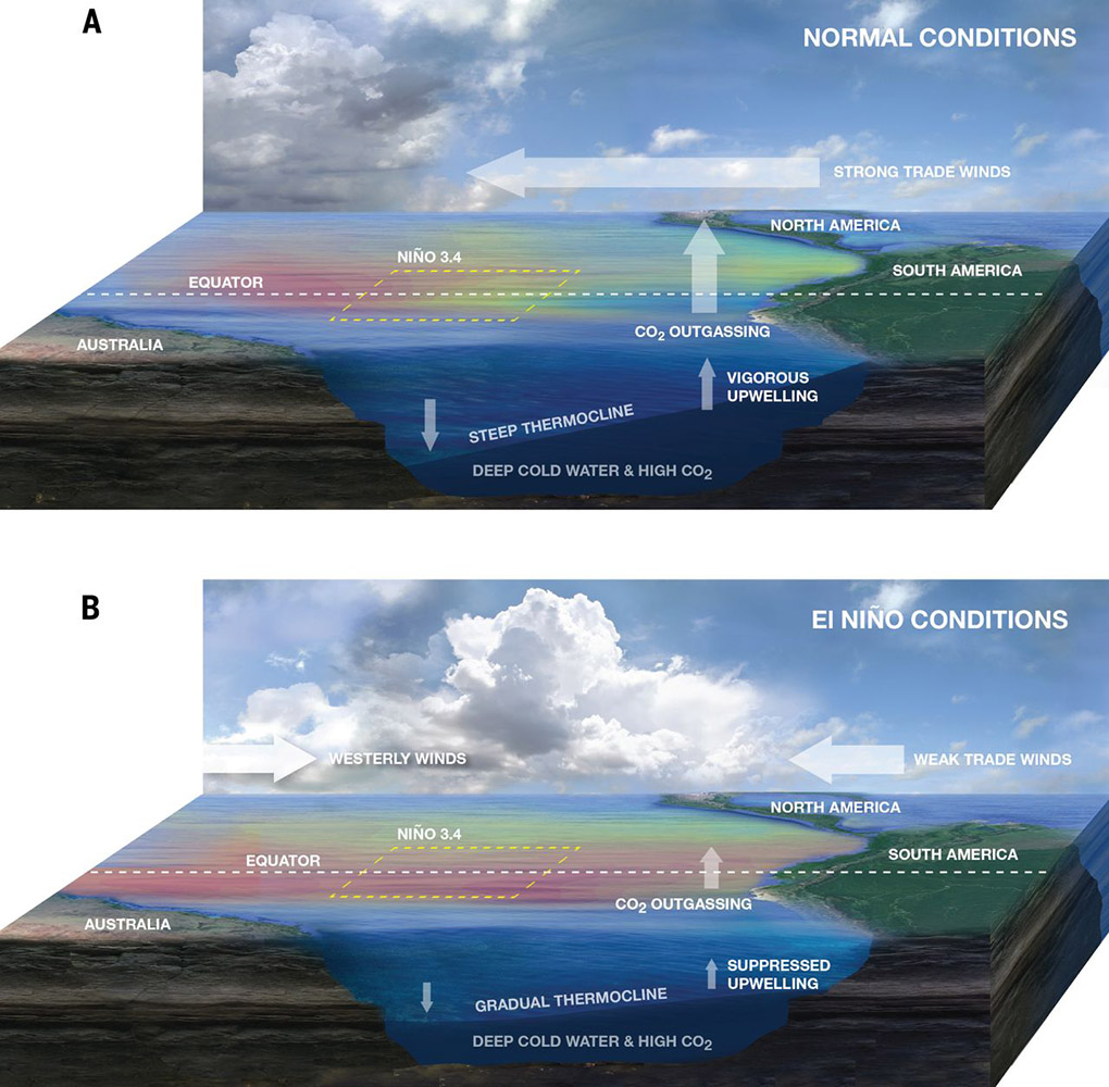 Während starker El Niño-Ereignisse kommt es insgesamt zu einem Anstieg der globalen atmosphärischen CO2-Konzentrationen. Dieser Anstieg ist vor allem auf die Reaktion des terrestrischen Kohlenstoffkreislaufs auf El Niño-induzierte Veränderungen der Wettermuster zurückzuführen. Aber neben der terrestrischen Komponente spielt auch der tropische Pazifik eine wichtige Rolle. Typischerweise ist der tropische Pazifik aufgrund des äquatorialen Auftriebs, der CO2-reiches Wasser aus dem Ozeaninneren an die Oberfläche bringt, eine CO2-Quelle für die Atmosphäre. Während des El Niño wird dieser äquatoriale Auftrieb im östlichen und zentralen Pazifik unterdrückt, wodurch die Zufuhr von CO2 an die Oberfläche verringert wird. Würden die CO2-Flüsse anderswo konstant bleiben, dürfte diese Verringerung der CO2-Flüsse vom Ozean in die Atmosphäre zu einer Verlangsamung des Wachstums des atmosphärischen CO2 beitragen. Diese Hypothese lässt sich jedoch ohne großräumige CO2-Beobachtungen über dem tropischen Pazifik nicht verifizieren.