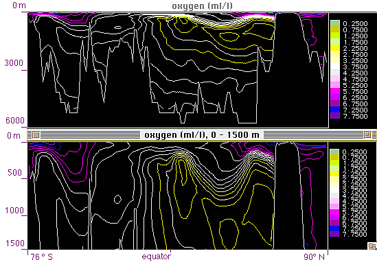 Deutlich ist die Abnahme der Sauerstoffkonzentration mit der Tiefe. An der Oberfläche liegt die Sauerstoffkonzentration über 7 ml/l in den Polarregionen und bei etwa 4,5 ml/l in den Tropen. Unter etwa 1.000 m fällt die Konzentration auf ca. 4 ml/l. Insbesondere die Tiefen des Nordpazifik sind sauerstoffarm (<2 ml/l). Solch extremen Werte sind nicht typisch für alle tiefen Ozeanbecken. Die niederen Sauerstoffkonzentrationen in der Tiefe haben meist ihre Ursache in der Sauerstoffaufnahme bei der Remineralisierung von Nährstoffen. Die Sauerstoffaufnahme durch Meeresorganismen besitzt nur eine sehr geringe Bedeutung.