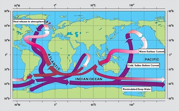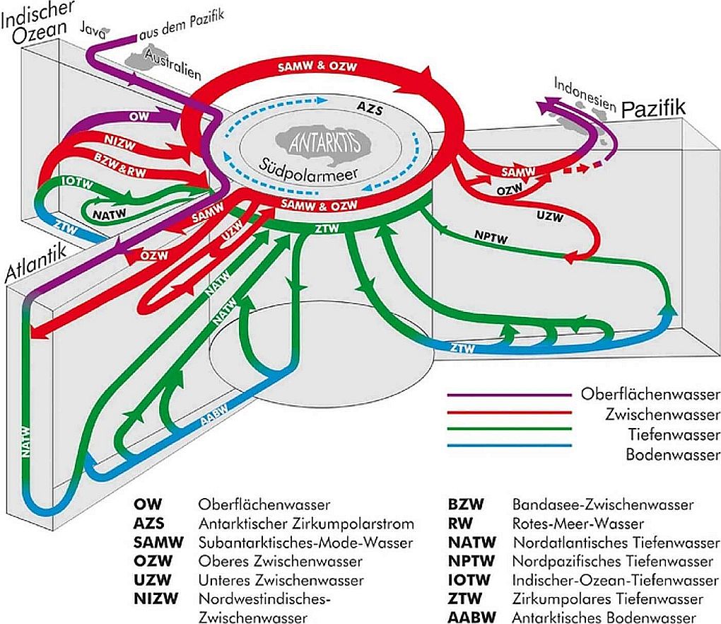 Die zweite wichtige Absinkregion liegt vor der Antarktis im Wedell-Meer. Im übrigen Ozean ist die aufsteigende Bewegung gleichförmig verteilt. Es ist praktisch der gesamte Ozean in die thermohaline Zirkulation einbezogen, ein Prozess, der für die meisten Vertikalbewegungen des Meerwassers verantwortlich ist.