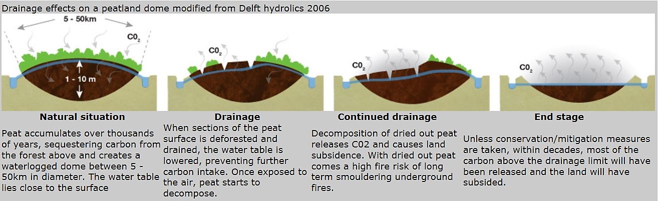 Entwässerungseffekte auf einen aufgewölbten Torfkörper Wald- und Torfbrände entwickeln sich zu einer globalen Bedrohung und führen zu einem öffentlichen Gesundheitsnotstand in Südostasien. Indonesien ist die Frontlinie. Und von hier stammt ein Großteil des Rauchs, der als Haze Wave bekannt ist. Über 75 % der Brandherde in Indonesien entstehen auf Torfland: teilweise verrottete, abgestorbene Vegetation, die sich über Tausende von Jahren angesammelt hat und typischerweise mit Wasser gesättigt ist - in ihrem natürlichen Zustand ist es praktisch unmöglich, sie in Brand zu setzen. Aber wenn sie gerodet und entwässert werden, um Platz für Plantagen wie Palmöl und Zellstoff und Papier zu schaffen, wird dieses kohlenstoffreiche Material zunderdürr - und anfällig für Brände. Quelle: Greenpeace |