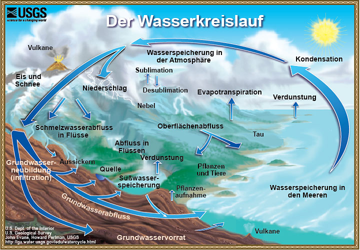 ![]() | Einfaches Schema des Wasserkreislaufs Unter dem Begriff Wasserkreislauf versteht man den Transport und die Speicherung von Wasser auf globaler wie regionaler Ebene. Hierbei wechselt das Wasser mehrmals seinen Aggregatzustand und durchläuft die einzelnen Sphären des Systems Erde wie Hydrosphäre, Pedosphäre, Lithosphäre, Biosphäre und Atmosphäre. Die Zirkulation des Wassers vollzieht sich in vereinfachter Vorstellung zwischen Meer und Festland. Im Wasserkreislauf geht kein Wasser verloren, es ändert nur seinen Zustand. Diese Zustände werden durch die Wasserhaushaltsgrößen vertreten und folglich im Wasserhaushalt bilanziert. Für den Wasserdampftransport sind atmosphärische Zirkulationssysteme von entscheidender Bedeutung, z.B. die tropischen Monsune und subtropischen Passate in den niederen Breiten und in den mittleren und höheren Breiten die durch den Jetstream gesteuerten Zugbahnen der Tiefdruckgebiete. Der Wasservorrat der Erde bleibt dabei letztendlich konstant. Quelle: USGS / Wikipedia |
