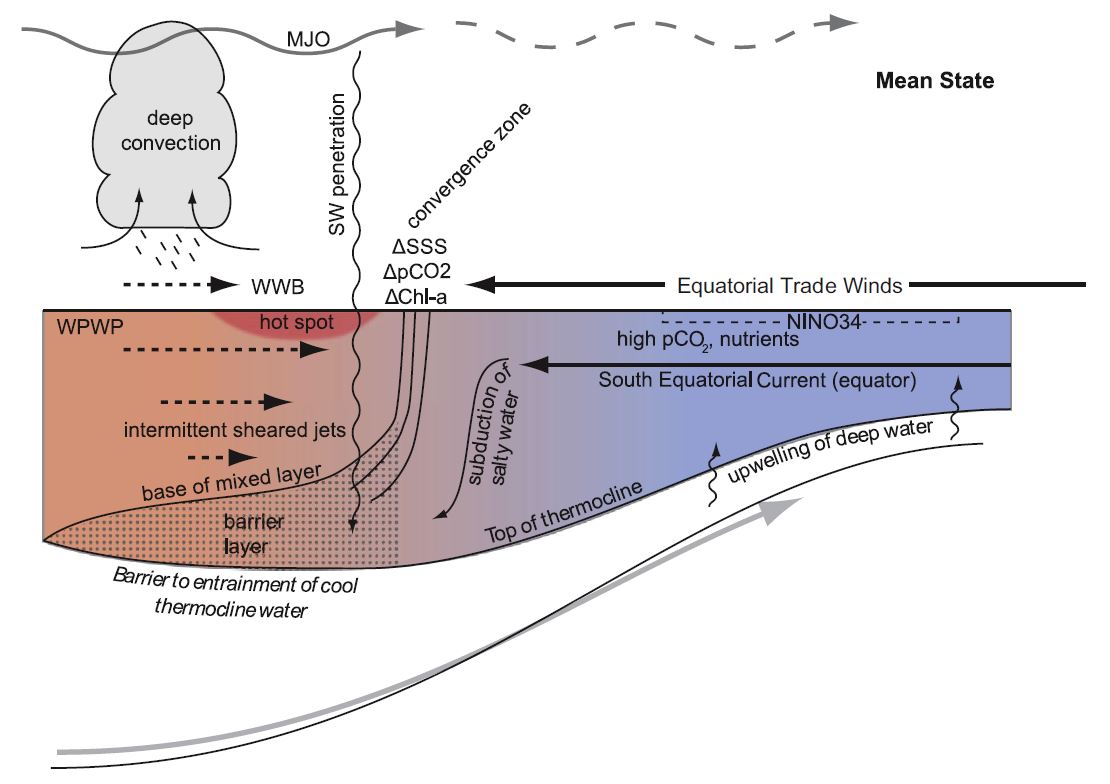 Nach Osten zu ist der WPWP durch starke Gradienten bezüglich Salinität, pCO2 und Chlorophyll von den deutlich unterschiedlichen Wassermassen des Ostpazifiks abgegrenzt (Warm Pool Edge).