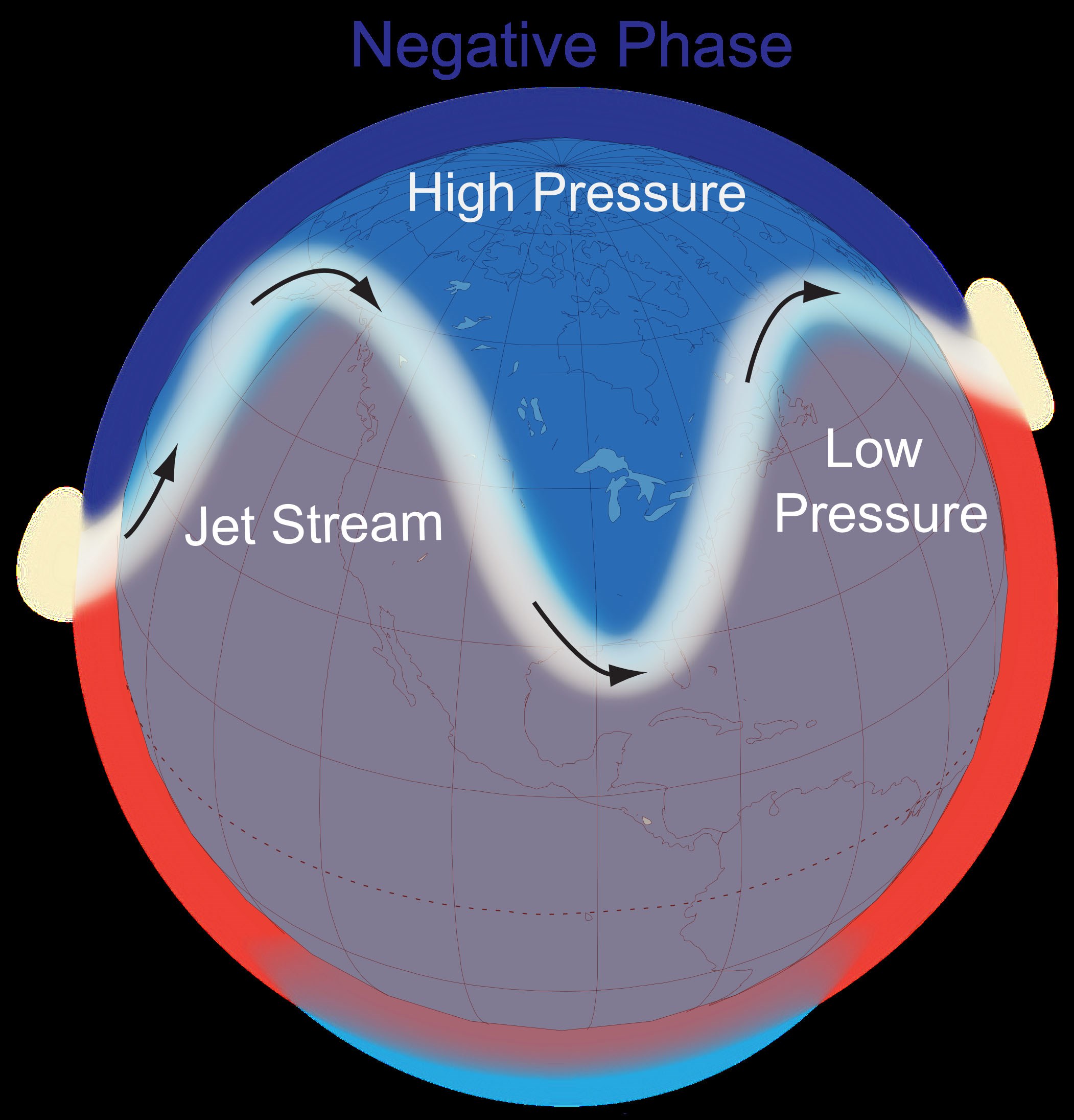 Die negative (kühle) Phase weist überdurchschnittlich hohen Luftdruck in der Polarregion auf und unterdurchschnittlich hohen Luftdruck in den Bereichen um 45° N. Dies erlaubt es kalter Luft in den Mittleren Westen der USA und nach Westeuropa einzudringen, Stürme bringen dann Regen in den Mittelmeerraum. Dies geschieht mit höherer Wahrscheinlichkeit über die Wintermonate.