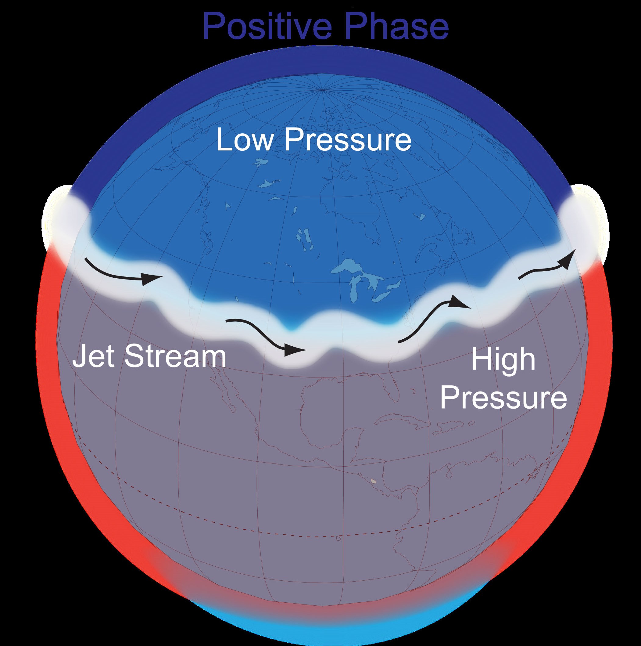 In der positiven (warmen) Phase treiben im Winter starke Westwinde die warme Meeresluft nach Alaska, Schottland, Nordeuropa und Sibirien sowie in die Polregionen. Dies hat direkte negative Auswirkungen auf die dortige Eisdicke. Kalifornien, Spanien und der Nahe Osten erfahren trockeneres Wetter.