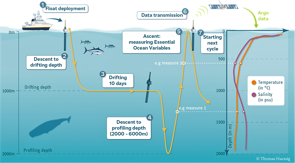 Batterien - Moderne Argo-Schwimmer verwenden Lithium-Batterien für die Stromversorgung der Pumpen, Sensoren, der Steuerung und des Kommunikationssystems. Die verfügbare Batterieleistung ist die Hauptbegrenzung für die betriebliche Lebensdauer einer Treibboje.
