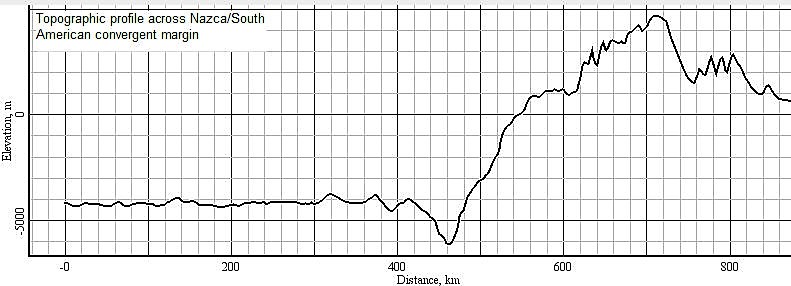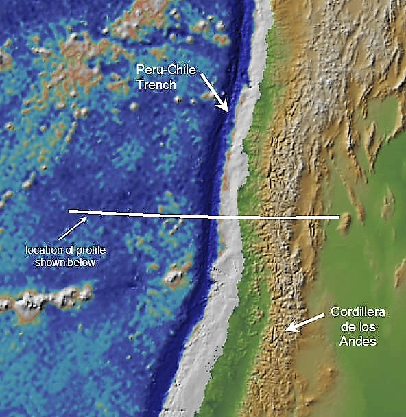 Der Atacamagraben ist sowohl in der bathymetrischen Karte links (dunkelblau) als auch in dem Profil oben deutlich erkennbar.