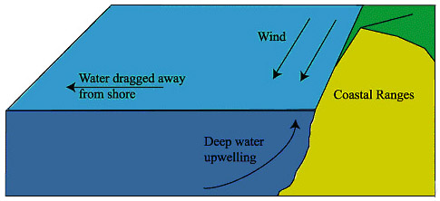 Der Küstenauftrieb erfolgt entlang der von östlichen Grenzströmungen umspülten Ufer (d.h. entlang der östlichen Teile der großen zentralen Ozeanwirbel). Diese durch Winde verursachten Strömungen werden durch die Corioliskraft umgeleitet, was dazu führt, dass Wasser vom Ufer weggeführt wird. Tiefes, kaltes Wasser steigt auf, um diese Wassermassen zu ersetzen, was zu einem Auftrieb an der Küste führt.