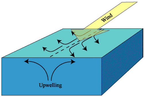 Winde entlang des Äquators (gestrichelte Linie) erzeugen Strömungen, die dann durch die Corioliskraft nach Norden und Süden abgelenkt werden. Das kalte, tiefe Wasser von unten steigt an die Oberfläche, um diese umgeleiteten Wassermassen zu ersetzen, was zu einem Auftrieb führt.