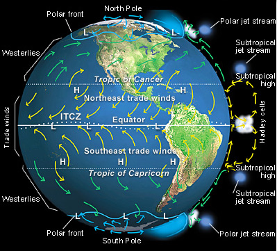 Wichtige Elemente der Allgemeinen Zirkulation der Atmosphäre. Sie repräsentieren die zeitlich gemittelten Wind- und Drucksysteme über der Erdoberfläche wie auch in der Troposphäre. Dazu gehören:
