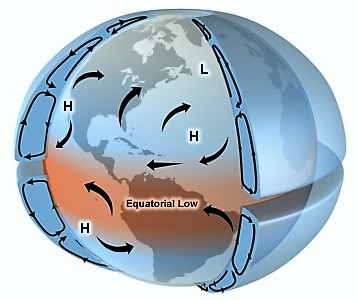 Es wird in den Abbildungen der Januar- und Juli-Situation auch deutlich, dass die Lage der Hochdruckzellen im Sommer gegenüber der Wintersituation verschoben ist. Die ITCZ kann als thermischer Äquator interpretiert werden. Das bedeutet, dass sie die jeweils wärmsten Bereiche der Erde nachzeichnet. Die Entstehung des tiefen Luftdrucks ist thermisch bedingt. Durch die hohen Temperaturen kommt es zu einer Aufwölbung der Isobaren und zu einem Luftmassenabfluss in der oberen Troposphäre. Damit geht eine Verminderung des Bodenluftdrucks einher.
