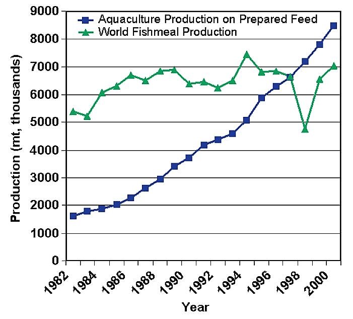 Entwicklung der weltweiten Produktion von Fischmehl und von in Aquakulturen und unter Einsatz von industriell gefertigten Futtermitteln erzeugten Arten wie Lachs, Garnelen, Aalen, Meeresfischen, diadromen Fischen und Bubtbarschen (Zahlen für 2000 geschätzt).