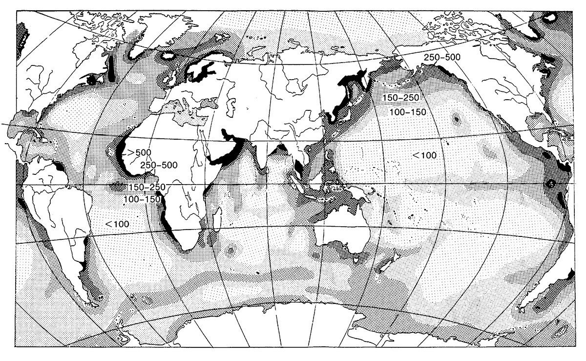 Die regionalen Unterschiede der pelagischen Primärproduktion im Meer (angegeben als Kohlenstofffixierung im mgC · m-2 · d-1). Die niedrigen Produktionswerte der subtropischen Strömungskreise sowie die Fruchtbarkeit der Flachmeere und Auftriebsgebiete sind deutlich erkennbar.