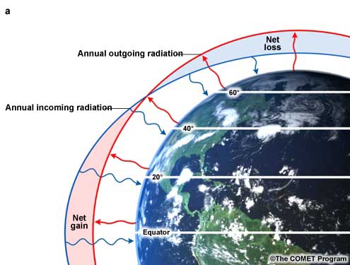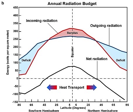 Eine Gegenüberstellung der Strahlungsbilanzwerte von niederen und hohen Breiten entlang eines meridionalen Profils verdeutlicht das Strahlungsungleichgewicht und damit das thermische Ungleichgewicht auf der Erde (Abb. oben).