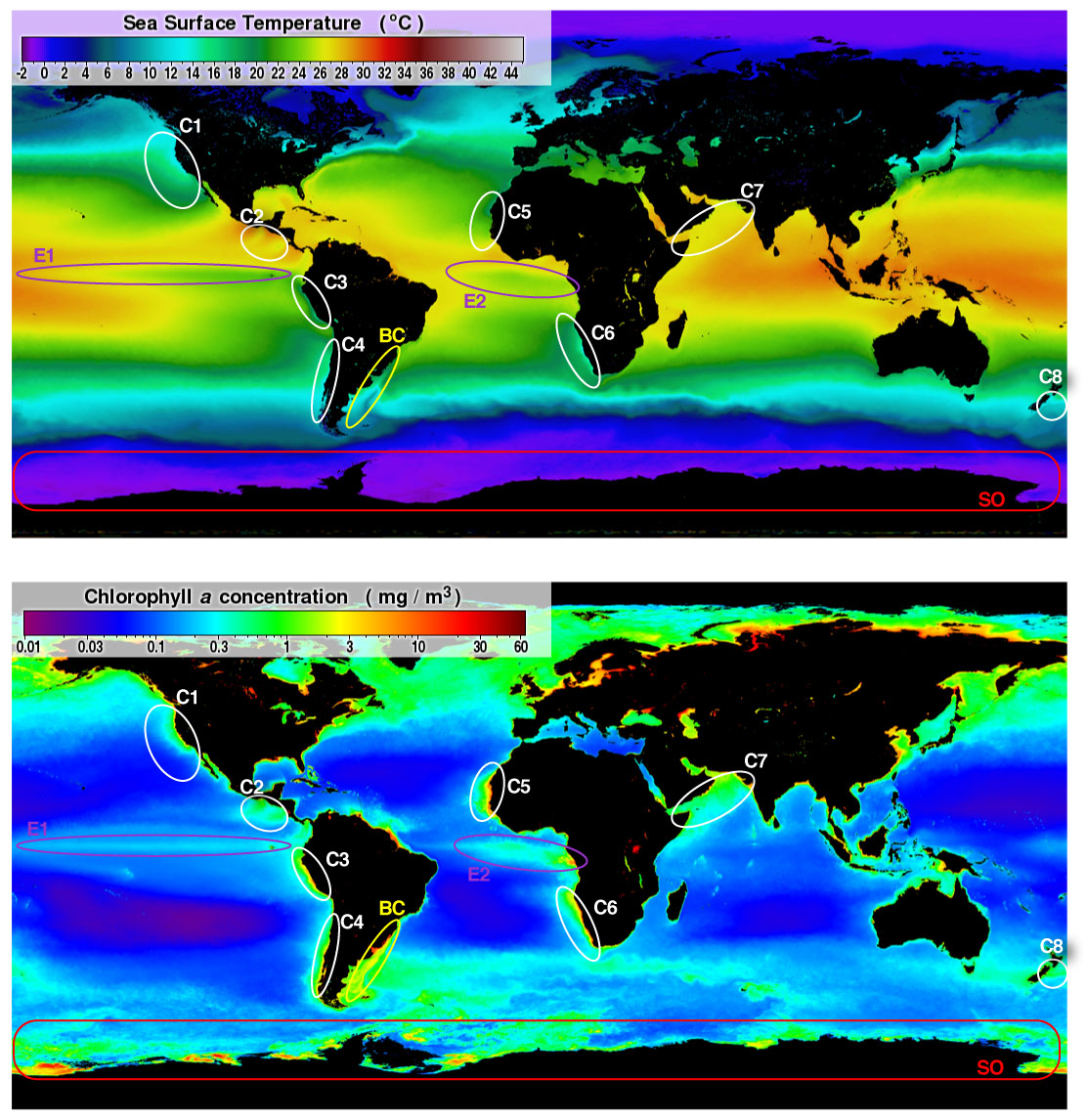 C1: California; C2: Pacific Central American coast; C3: Peru; C4: Chile; C5: West Africa; C6: Benguela; C7: Arabian Sea; C8: Eastern New Zealand; E1; Equatorial Pacific; E2; Equatorial Atlantic; BC: Brazil Current/Malvinas Current interaction zone. SO: Southern Ocean
