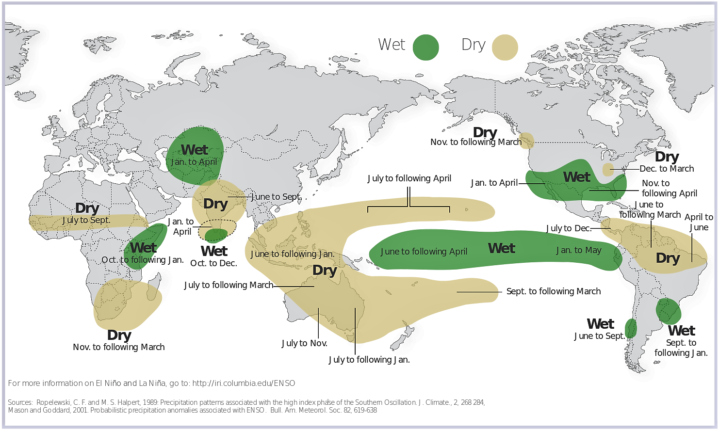 In einem normalen und typischen von Dezember bis April reichenden Zeitabschnitt erreicht der pazifische Warmwasserkörper (Pacific Warm Pool) seine größte Ausdehnung, die Wassertemperaturen im zentralen und im zentral-östlichen Bereich des äquatorialen Pazifiks erreichen ihre höchsten Werte und die tropische Konvektion erstreckt sich von Indonesien bis zur Datumsgrenze.