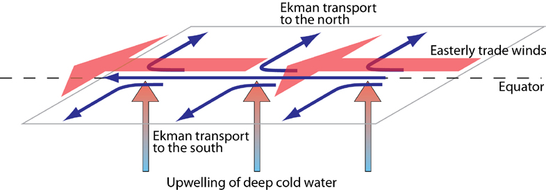Wenn in der Nähe des Äquators über einen längeren Zeitraum ein Wind auf der Meeresoberfläche weht, fließt die resultierende Oberflächenströmung nicht wie zu erwarten in Windrichtung. Stattdessen ist die durchschnittliche Strömung als Folge der Corioliskraft 90° links von der Windrichtung auf der S-HK bzw. rechts vom Wind auf der N-HK. Ein wichtiges Beispiel für den Ekman-Transport findet auf beiden Seiten des Äquators statt, wo die östlichen Passatwinde in der südlichen Hemisphäre eine Wasserbewegung nach Süden (d.h. 90° links von der Windrichtung) und in der nördlichen Hemisphäre eine Wasserbewegung nach Norden (d.h. 90° rechts von der Windrichtung) verursachen. Das Ergebnis ist, dass das Wasser auf beiden Seiten vom Äquator wegfließt. Um diese durch den Ekman-Transport verursachte Oberflächendivergenz auszugleichen, wird kühles Wasser aus dem Untergrund emporgezogen, ein Vorgang, der als "Upwelling" bezeichnet wird. Am Äquator direkt gibt es keine Corioliskraft, und das Oberflächenwasser fließt in der gleichen Richtung wie der Wind.
