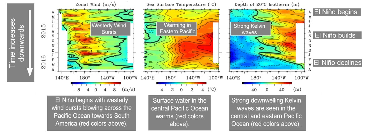 Diese wärmeren als üblichen Ozeantemperaturen sind verbunden mit einer Absenkung der Thermokline vom zentralen bis zum östlichen Pazifik. Auch trägt ein schwächeres Upwelling von kühlerem Wasser aus der Tiefe zu höheren Meeresoberflächentemperaturen bei.