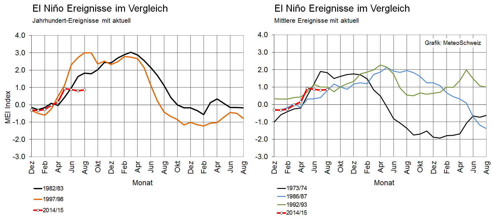 Sehr starke (links) und mittlere El Niño-Ereignisse (rechts) im Vergleich zur aktuellen Entwicklung (rote Linie).