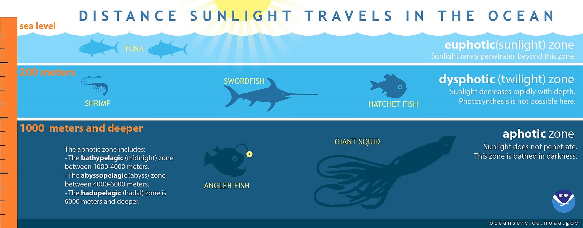 Einige Meeresbewohner sind auf Licht angewiesen, um zu leben, andere kommen ohne Licht aus. "Photisch" ist eine Ableitung von "Photon", dem Wort für ein Lichtteilchen.