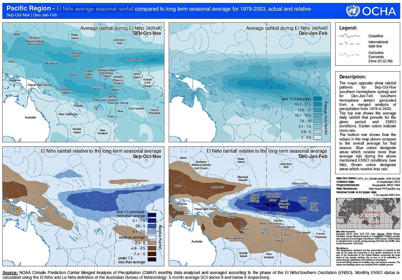 Die obere Reihe zeigt den durchschnittlichen täglichen Niederschlag, der für den gegebenen Zeitraum und die ENSO-Bedingungen vorherrscht. Dunklere Farben zeigen mehr Regen an. Die untere Zeile zeigt, wie die Werte in der obigen Karte im Vergleich zum Gesamtdurchschnitt für diese Jahreszeit aussehen. Blaue Farben kennzeichnen Gebiete, die unter den oben genannten ENSO-Bedingungen (siehe Titel) mehr als den durchschnittlichen Niederschlag erhalten. Braune Farben kennzeichnen Gebiete, die weniger Regen erhalten. Quelle: UNOCHA
