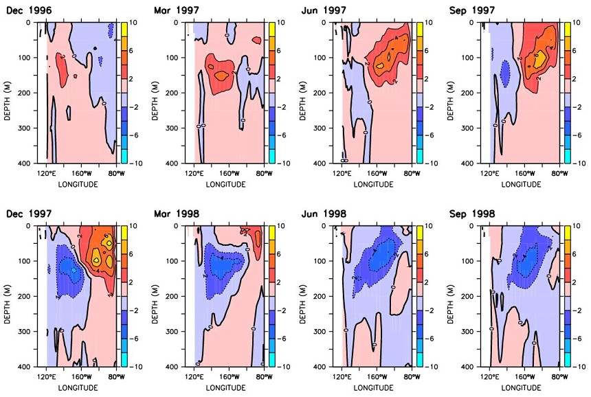 Die zeitliche Entwicklung der Temperaturen in den oberen 400 m des äquatorialen Pazifiks zwischen Dezember 1996 und September. Dieser Zeitabschnitt ist durch die Entwicklung eines starken El Niño und einer starken La Niña gekennzeichnet. Die Temperaturanomalien sind in Abständen von 3 Monaten gezeigt. Man erkennt deutlich zunächst die ostwärtige Wanderung einer warmen Anomalie, gefolgt von der Wanderung einer kalten Anomalie. Auf diesen Anomalien basiert das Vorhersagepotenzial von ENSO.