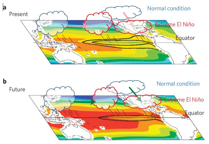 Der alle paar Jahre wiederkehrende El Niño im äquatorialen Pazifik ist zwar ein im Rahmen der natürlichen Klimavariabilität auftretendes Phänomen. Obwohl die Unsicherheiten noch groß sind, sagen einige Klimamodelle eine zunehmende Intensität von El Niño-Bedingungen durch den Einfluss des Menschen voraus. Normalerweise kommt es durch die Passatwinde zum Auftrieb von kaltem Wasser im Pazifik vor Südamerika. Warmes Oberflächenwasser strömt dann von Südamerika nach Südostasien. Unter El Niño-Bedingungen sind die Passatwinde abgeschwächt und es kann sogar eine entgegengesetzte Strömung entstehen. Als klassisches Muster erwärmt sich dann der südöstliche Pazifik vor Südamerika. Die Wirkung einer derartigen Veränderung der ozeanisch-atmosphärischen Zirkulationsmuster wäre um den ganzen Globus zu spüren, zum Beispiel in Form von Dürren in Australien und Südostasien und verstärktem Niederschlag an den westlichen Küsten Amerikas. Sogar ein Zusammenhang zwischen El Niño und ungewöhnlich kalten Wintern in Europa wird diskutiert.