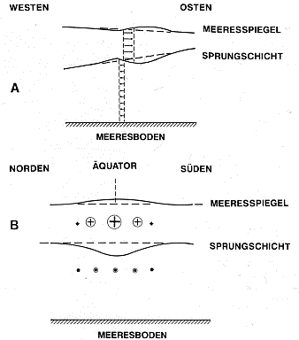 Schematische Darstellung einer äquatorialen Kelvinwelle auf einem Schnitt entlang des Äquators (A) und senkrecht zum Äquator (B). Der sich nach Osten verlagernde Wellenberg bewirkt eine Anhebung der Meeresoberfläche und eine Absenkung der Sprungschicht, die mit Druckgradienten verbunden sind. Unter dem Einfluss der Corioliskraft wird unter dem Wellenberg der ostwärtige Strom (+) über der Sprungschicht und der westwärtige Strom (•) unter der Sprungschicht verstärkt. (Nach Mysak, 1986)