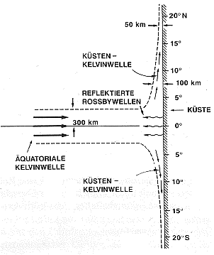 Schematische Darstellung des Auftreffens einer äquatorialen Kelvinwelle auf die Küste unter Umformung in Kelvinwellen, die an der Berandung polwärts wandern, und Rossbywellen, die sich nach Westen ausbreiten. (Nach Mysak, 1986)