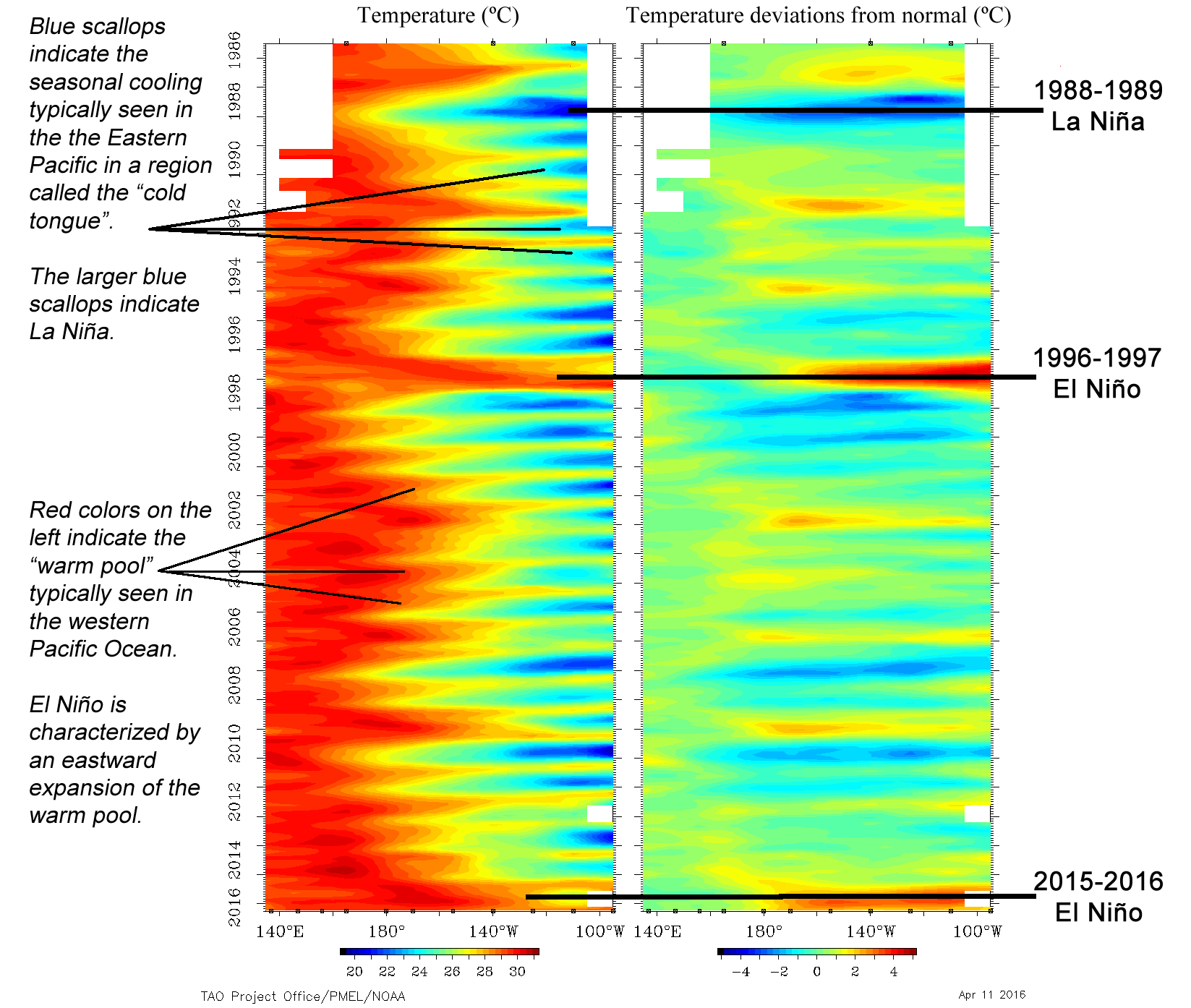Beachtenswert ist das Wechselspiel von normaler saisonaler Erwärmung (rote Ausschläge) und Abkühlung (blaue Ausschläge). Bei El Niño-Ereignissen sind die roten Ausschläge deutlich markanter, bei La Niña-Ereignissen die blauen.