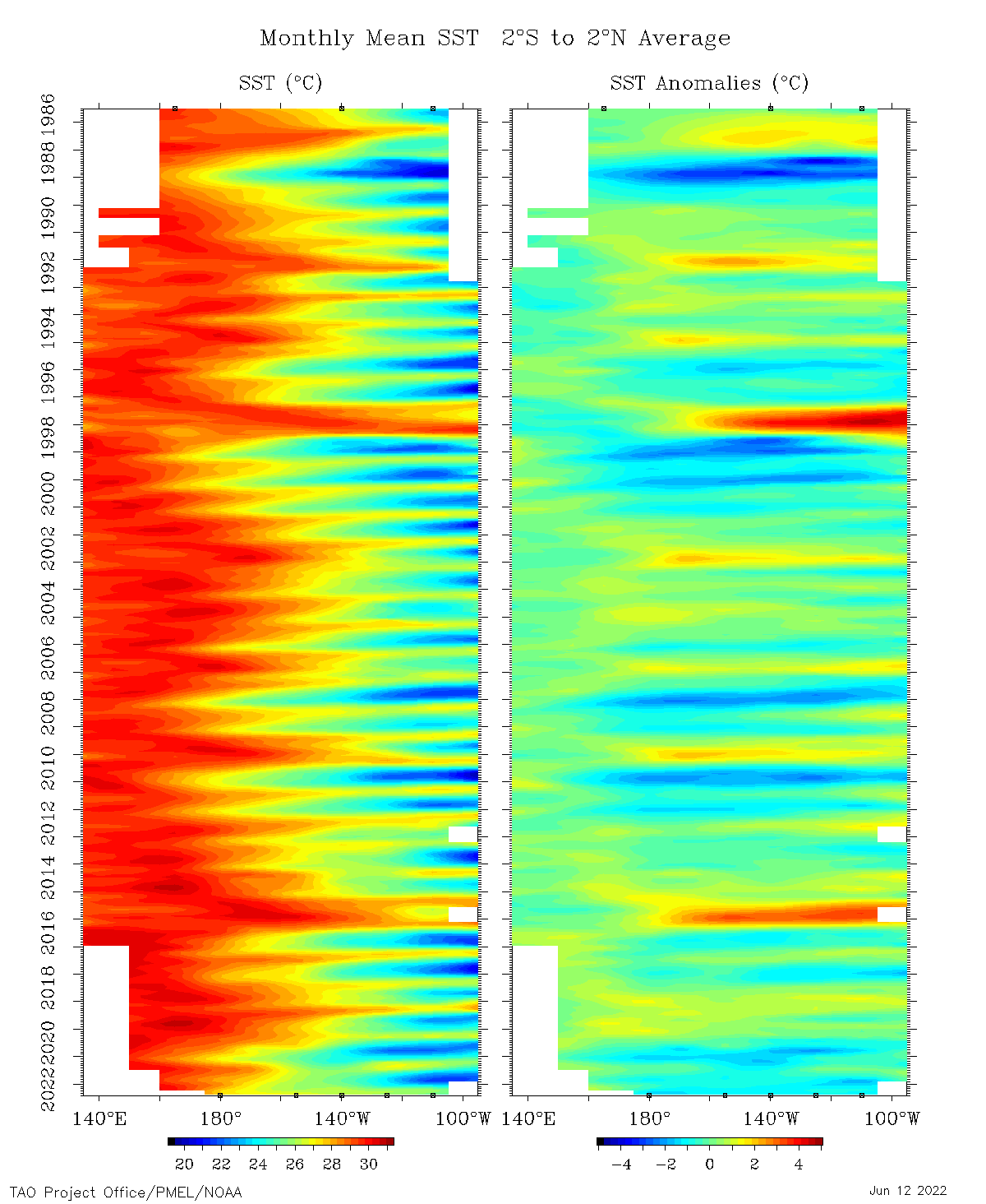 Die Warm- und Kaltereignisse sind in diesen Hovmöller-Diagrammen mit Hilfe von Daten zur Meeresoberflächentemperatur (SST) nachgewiesen. Die linke Version der Doppeldiagramme stammt vom 12. Juni 2022. Sie kann über den Link zur Quellenangabe aktualisiert werden. Die rechte Mustergrafik ist von 2016 und enthält Erläuterungen.
