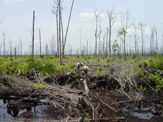 By the time the project was abandoned, major damage had been done to the regional and global environment. Forestry resources had been ransacked, government money had been misappropriated, and the economy and quality of life of indigenous people had been irreparably disrupted. Five years after the Mega Rice Project commenced, one million hectares of wetland landscape lie in ruins, a wasteland testimony to human greed and stupidity. The peat swamp forest is either gone or in terminal decay. The 60,000 settlers who were transferred to part of the area can grow neither rice nor enough substitute crops to exist. Disease and poverty are rife. Many have reverted to despoiling the nearest remaining forest for firewood. Others have joined the legion of illegal loggers, who are financed by a new generation of crooks replacing the Suharto cronies in raping this sensitive landscape. [...]