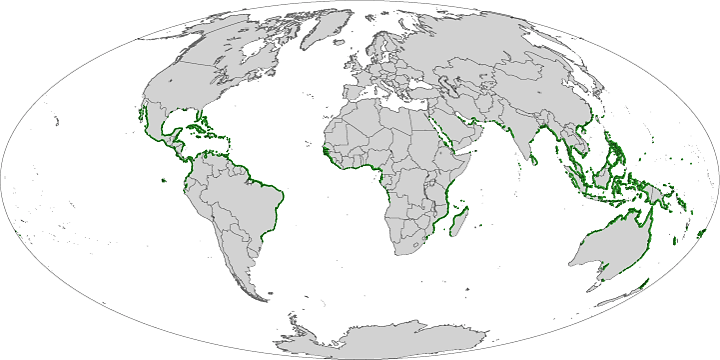 Diese Karte zeigt die Lage und relative Dichte von Mangroven, die etwa 137.760 km² der Erdoberfläche bedecken. Die Wälder sind in 118 verschiedenen Ländern und Territorien zu finden, wobei fast 75 Prozent der Fläche in nur 15 Ländern vorkommen.