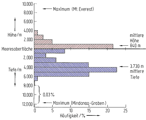 Rechts: Häufigkeitsverteilung der Höhen und Tiefen auf der Erde