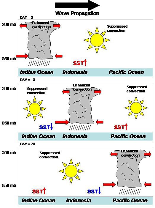 Mit einem 30- bis 60-tägigen Zyklus von steigendem und fallendem Luftdruck stellt die MJO eine wichtige Variabilität der tropischenAtmosphäre dar. Die MJO äußert sich in einer langsamen ostwärtigen Wellenbewegung atmosphärischer Störungen mit maximalen Amplituden in der östlichen Hemisphäre. Die erdumfassenden Wellen erstrecken sich über 20 Breitengrade beidseits des Äquators. Konkret bewirkt dieser Takt, dass in vielen tropischen Regionen erst mächtige Wolkenfelder von West nach Ost ziehen, denen dann eine Reihe von klaren, trockenen Tagen folgt.