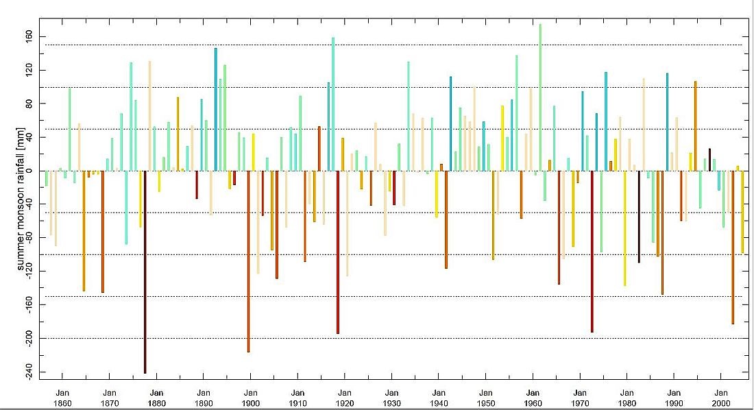 Das Diagramm korreliert die Intensität der Niederschläge über Indien mit Warm- und Kaltphasen des ENSO-Zyklus. Die Länge der Balken gibt die relative Stärke der indischen Monsun-Niederschläge wider: Positive Werte bedeuten mehr Niederschlag als normal, die negativen Werte stehen für Dürren. Die Farben stehen für die Intensität von ENSO-Erscheinungen für die Zeit von Oktober bis Januar des betreffenden Jahrs: Rot ist ein El Niño-Ereignis, blau ein La Niña-Ereignis, der weißliche Farbton repräsentiert normale Meeresoberflächentemperaturen im östlichen bis zentralen äquatorialen Pazifik (NINO3-Region). Es wird deutlich, dass die meisten Dürren während Warmphasen auftreten und selten während La Niña-Ereignissen. Umgekehrt kommt es während La Niña-Ereignissen zu überdurchschnittlichen Niederschlagsmengen.