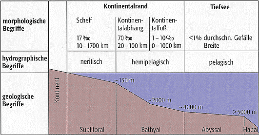 Vertikal lässt sich der Ozean in Kontinentalrand und Tiefsee sowie deren weitere Differenzierungen gliedern.
