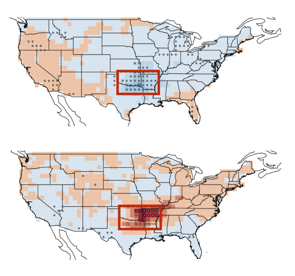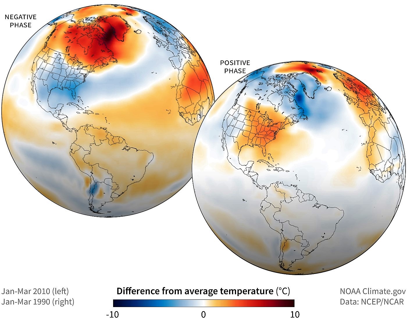 Late winter temperatures compared to the 1981-2010 average when the North Atlantic Oscillation (NAO) was strongly negative (top, Jan-March 2010) and when it was strongly positive (bottom, January-March 1990). Winters are often cooler than average across the mid-latitudes when the NAO is negative, and warmer than average when it is positive. NOAA Climate.gov image, based on data from the Physical Sciences Lab.