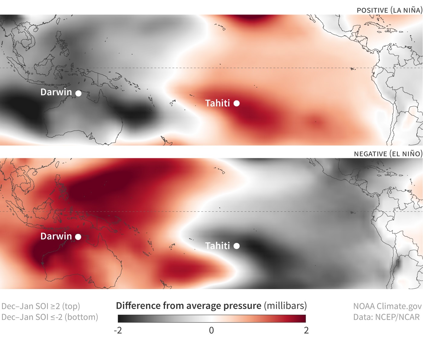 Dargestellt ist die Abweichung vom durchschnittlichen Meeresspiegeldruck in Wintern, in denen der Southern Oscillation Index stark positiv (oben) oder negativ (unten) ist. Während La Niña (positiver SOI) ist der Druck über dem zentralen Pazifik in der Nähe von Tahiti höher als der Durchschnitt (rot) und über Australien niedriger als der Durchschnitt (grau). Während El Niño ist der SOI negativ, und die Anomalien kehren sich um.