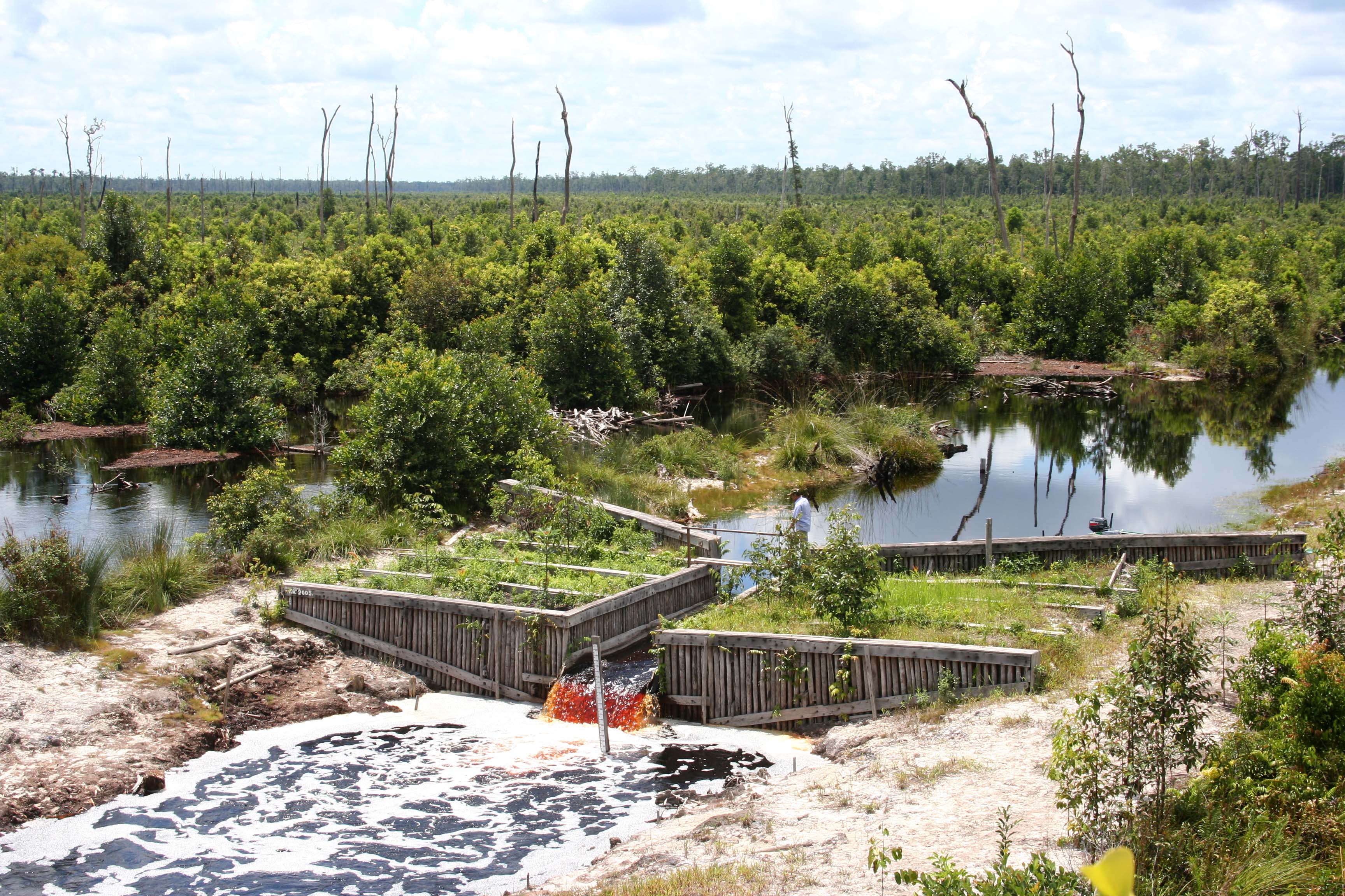 Damm, der vom WWF-Indonesien errichtet wurde, um einen der illegalen Abholzungskanäle zu blockieren, die den Sebangau-Nationalpark in Zentralkalimantan entwässern. Der junge Wald hinter dem Damm hat sich in einem Gebiet regeneriert, das völlig verbrannt war. Der ursprüngliche tropische Torfsumpfwald ist weit im Hintergrund zu sehen.
