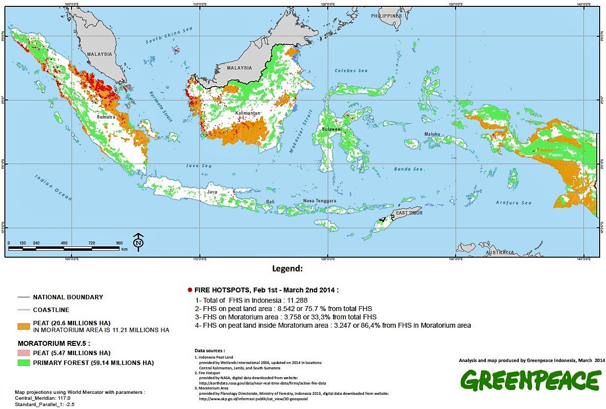 Im Mai 2011 führte Indonesien ein zweijähriges Moratorium für Genehmigungen von neuen Konzessionen in Primärwäldern und Torfgebieten ein. Während dieses Moratorium ein willkommener Schritt war, schützt es nicht alle Wälder und Torfgebiete. Eine Greenpeace-Analyse zeigt, dass im Februar 2014 mehr als 30 % der Brandherde ausgerechnet auf Flächen entstanden, die durch das Moratorium geschützt werden sollten. Von allen Brandherden auf Moratoriumsland traten fast 80 % auf Torfgebieten auf, trotz des erklärten Ziels des Moratoriums, neue Landrodungen in diesen Gebieten vorübergehend zu stoppen. Quelle: Greenpeace