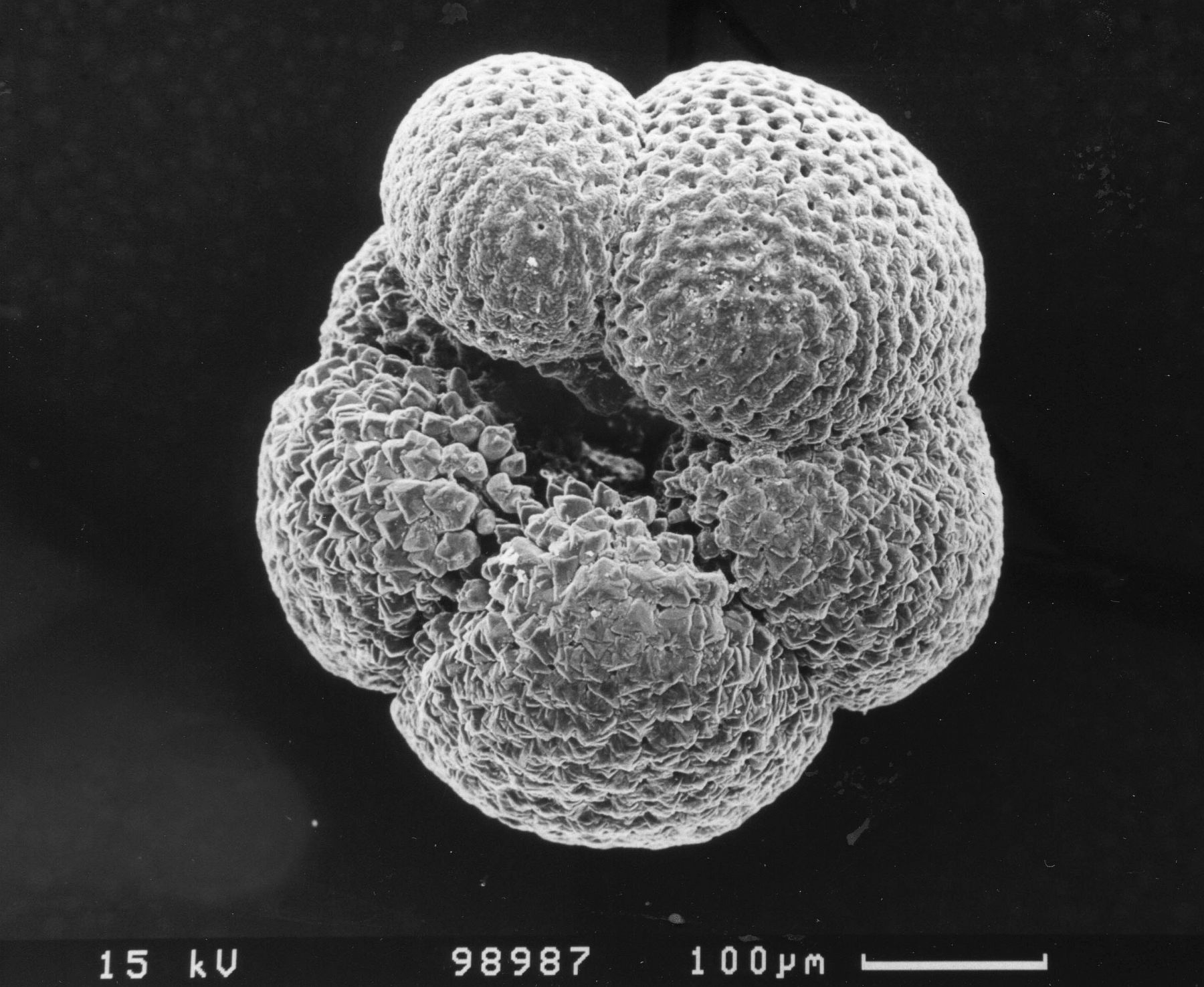 Bild rechts: Mikrofossilien wie dieser planktisch lebende Einzeller (Foraminifere), die aus den ozeanischen Schlammablagerungen extrahiert werden, speichern in ihren Kalkschalen die Ozean- und Klimaentwicklung der Vergangenheit. Das Verhältnis bestimmter Isotope in den kalkigen Schalen der Foraminiferen kann sehr genau Auskunft über die vergangenen Temperaturen und Salzgehalte des umgebenden Meerwassers geben. Ähnliche Informationen erbringen die organischen Molekularverbindungen, die von kalkbildenden Algen (Coccolithophoriden) produziert werden.