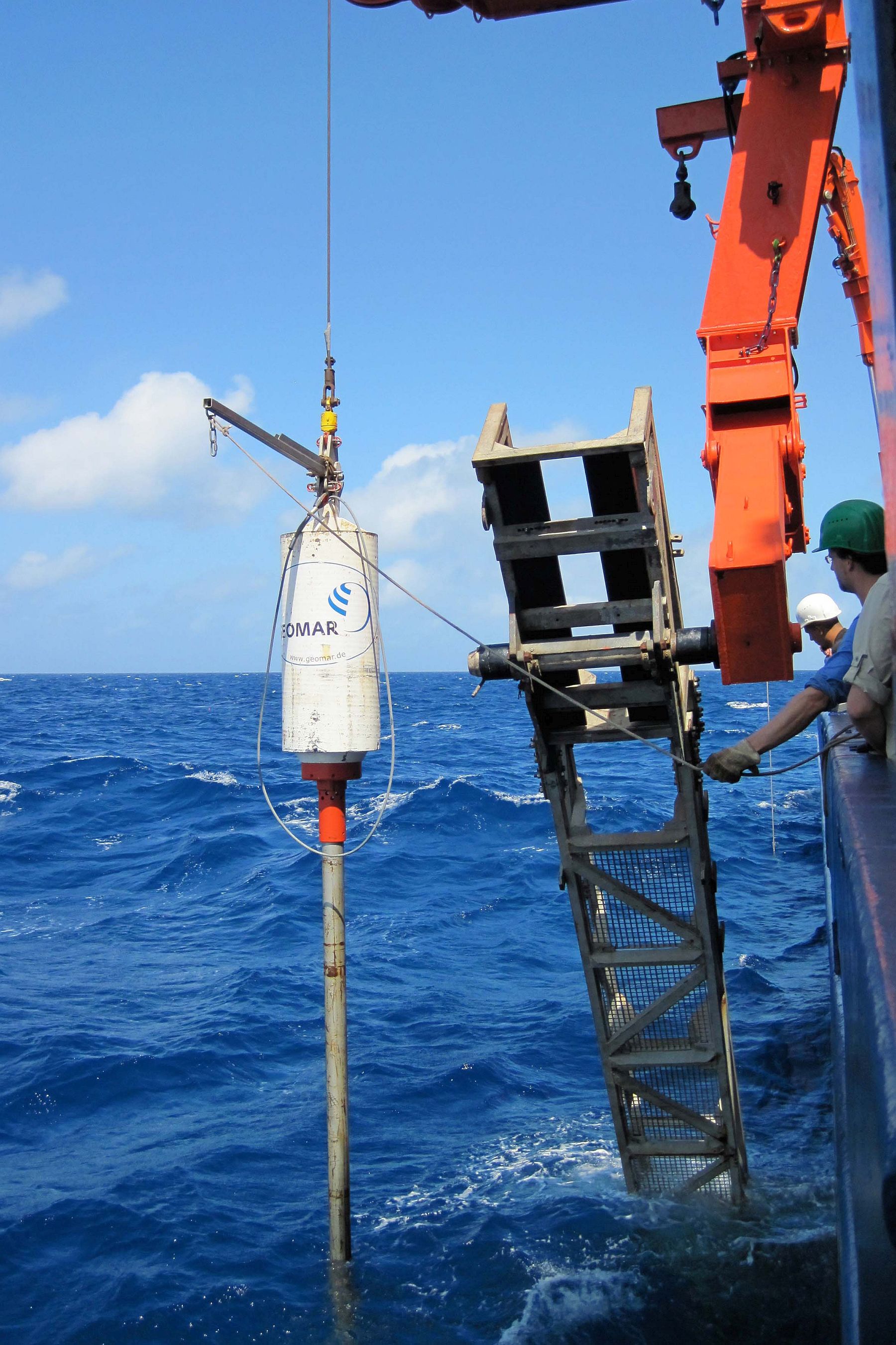 Bild links: Die Gewinnung von Sedimentbohrkernen aus der Tiefsee erfolgt mit sogenannten Kolbenloten.