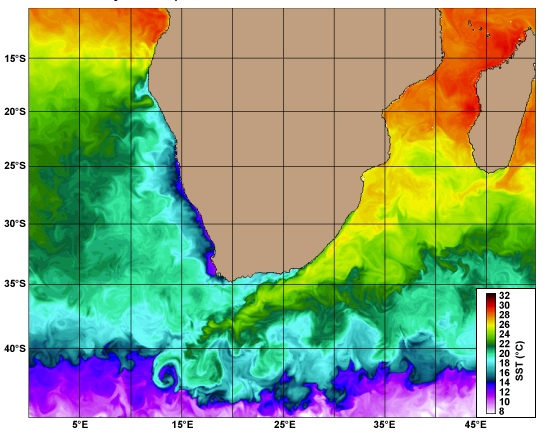 In der Grafik sind vor SW-Afrika außer dem Upwelling-Gebiet auch die Auswirkungen des kalten Benguela-Stroms auf die Wassertemperaturen erkennbar und auf der Ostseite des südlichen Afrikas die des warmen Agulhas-Stroms.