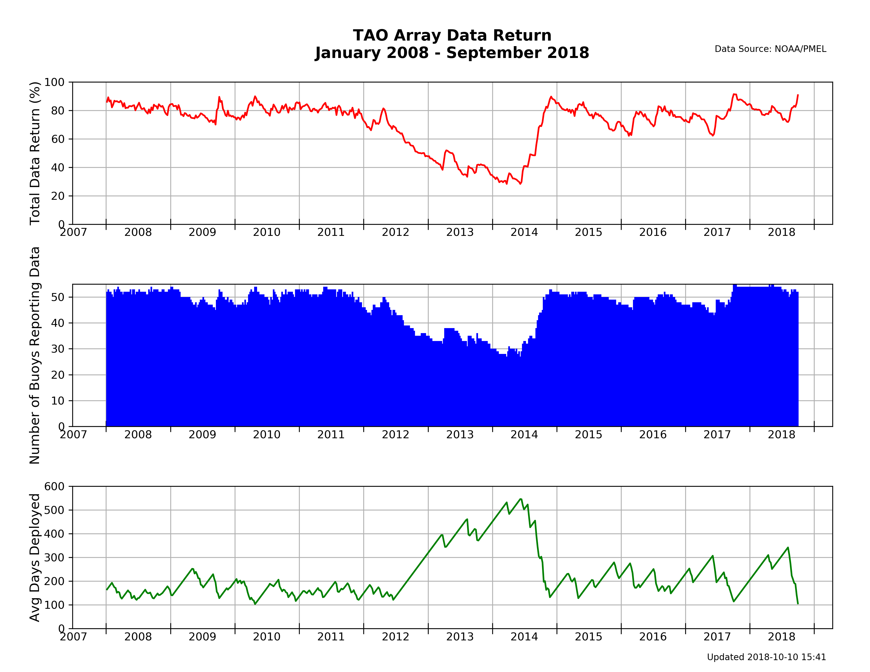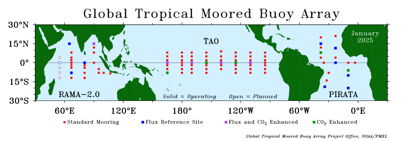 In den frühen Zehnerjahren erfuhr das Tropical Atmosphere Ocean (TAO) array durch Etat-Kürzungen und damit verbundene Reparaturversäumnisse einen markanten Einbruch seiner Datenlieferungen. Dies beraubte Wissenschaftler wichtiger Daten über eine Region, die das weltweite Wetter und Klimatrends beeinflusst. (nature)