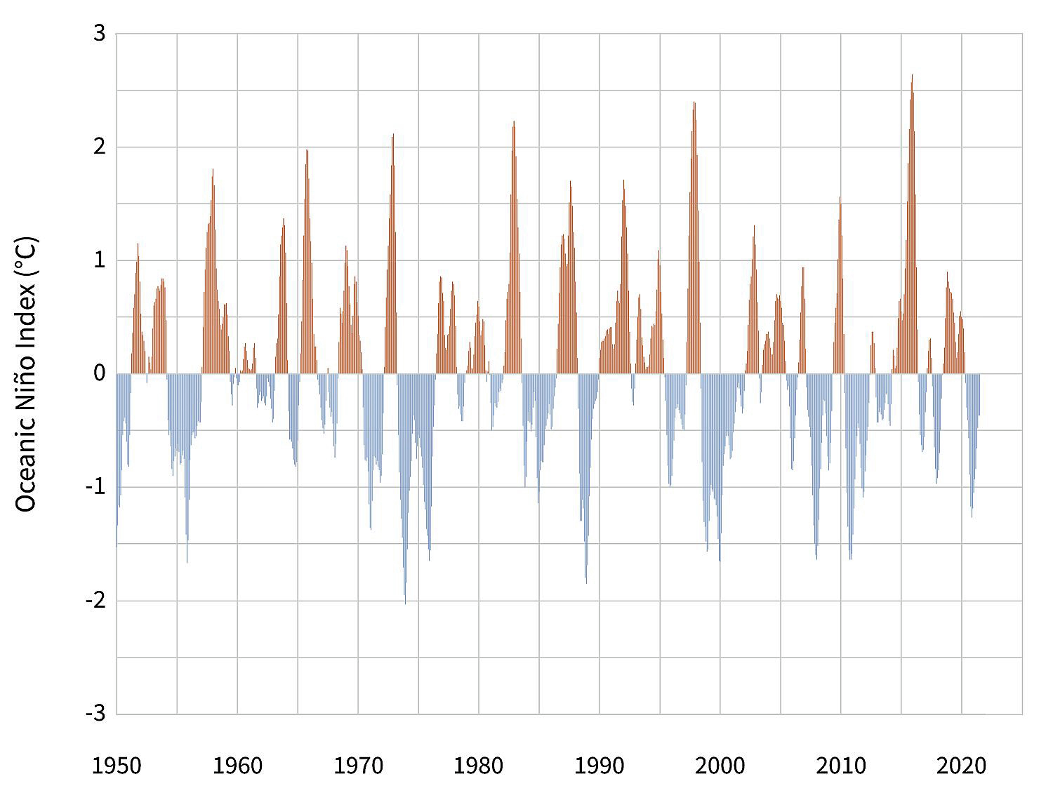 Der Ozeanische Niño-Index (ONI) von 1950 bis 2021 Der ONI ist die dreimonatige Temperaturanomalie der Meeresoberfläche in der Niño3.4-Region des tropischen Pazifiks. Rot bedeutet überdurchschnittliche Temperaturen und blau bedeutet unterdurchschnittliche Temperaturen. Quelle: Climate.gov image using data from NOAA NWS Climate Prediction Center. |